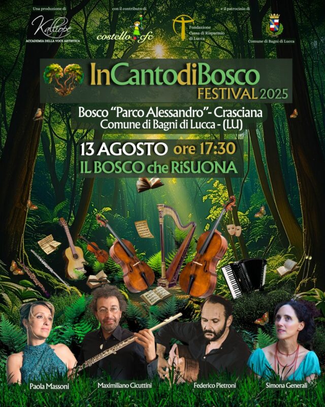 BAGNI DI LUCCA – Dopo l’emozionante inaugurazione di “Incantodibosco Festival” con lo spettacolo Il Bosco che InCanta, scritto e interpretato dal soprano Paola Massoni, accompagnata da Anastassia Ossipova, Elisabetta Casapieri e Massimo Signorini, che ha trascinato il pubblico in un’atmosfera fiabesca e commovente, il 13 agosto alle 17:30 nel Parco Alessandro di Crasciana (comune di Bagni di Lucca) sarà la volta del Concerto narrante Il Bosco che Risuona: la voce dell’attrice Simona Generali si intreccerà alla recitazione e al canto di Paola Massoni, tra i suoni del flauto argentino di Maximiliano Cicuttini e la chitarra flamenca di Federico Pietroni.