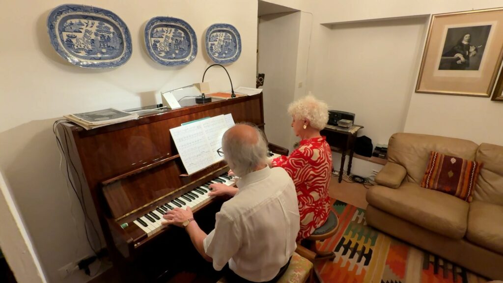 Un concerto per pianoforte a quattro mani realizzato Mariella Baiocchi e Arturo Pivato, moglie e marito, che dal 2020 si esibiscono alla finestra di casa propria per allietare il pubblico radunato nella sottostante piazza Galletto, quest’anno con le note di Dvorak, Mascagni e Moszkowki