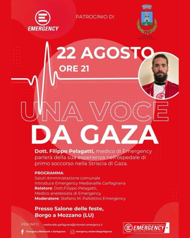 BORGO A MOZZANO – Raccontare l’orrore della Striscia di Gaza attraverso le parole di chi, quell’orrore, lo ha vissuto sulla propria pelle. Venerdì 22 agosto, alle 21, nella Sala delle Feste di Borgo a Mozzano il dottor Filippo Pelagatti, medico di Emergency, parlerà delle settimane vissute nell’ospedale di primo soccorso della Striscia di Gaza.