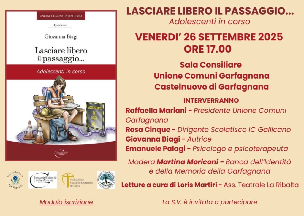 Si presenta venerdì 26 settembre alle ore 16.30, presso la sede dell’Unione Comuni Garfagnana, il lavoro della Prof.ssa Giovanna Biagi inserito nella sezione “Quaderni” della collana editoriale dell’Ente Banca dell’Identità e della Memoria. Il titolo “Lasciare libero il passaggio. Adolescenti in corso” vuole proprio sottolineare il valore formativo di questo testo che si propone di accompagnare gli alunni durante il loro percorso scolastico rappresentando uno strumento prezioso di orientamento verso le scuole superiori.