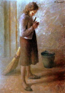 Nei quadri di Cordati che raffigurano personaggi, bimbi, donne e altro, nella quasi totale mancanza di un sorriso, in ogni pittura, sui volti pensierosi si disegna una vicenda vissuta o che incombe, storie che mai sapremo quali siano, però ci sono e traspaiono negli atteggiamenti raccolti e taciturni. Per esempio nella tela “Ragazza con la scopa”, questa ha sotto braccio lo strumento della pulizia e par che potrebbe essere passato il postino e gli abbia consegnato una lettera, che lei ora attentamente legge sperando chissà cosa. Forse è quel suo lui di là dall’oceano che ora la carezza con parole d’amore e lei al tempo stesso, un poco muore e poi spera.