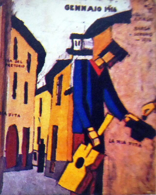 Quest’osservazione di Parronchi si amplia poco più sotto, quando lo stesso, soffermandosi ancora sulla possibile genesi del Cantastorie, osserva che ci fu pure un altro poeta, soggiunge, dimenticato, che dell’uomo volle dare una sua personale dimensione, come Pascoli ci dice del fanciullino, questi parla della marionetta, che “improvvisa sbuca da dentro e sgambetta”. Non sa dire se Magri abbia mai conosciuto l’autore che fu Guido Pereyra (Firenze 1881- 1968), e se mai abbia saputo di ciò che egli dice in proposito nel VII canto del suo “Libro del Collare”, databile al 1913-14 e noi possiamo solo aggiungere che in quegli anni ci fu un breve ritorno a Firenze di Magri ma qui ci fermiamo. Parronchi ci invita ancora a riflettere che il 1914 è l’anno in cui nasce la marionetta più celebre al mondo: Charlot. Comunque sia non si sottovaluti l’aspetto che si dipinge evidente nei quadri di Magri, ossia, che la sua “marionetta cubista” cerca, tende la mano per un’elemosina, forse vorrebbe comprensione, compassione, come fosse, appunto, “Il mendico” di Pascoli.