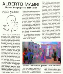 Si ricorda anche di quando Magri con il quadro “Piazza Garibaldi”, titolo dell’articolo, vinse a Lucca l’anno 1934 il Premio Caselli e alla vista di quella pittura, quanto di essa chiacchierarono i critici così la gente che la vide. Allora Magri era direttore a Barga della Monte de Paschi di Siena, e dovette portare per qualche giorno il quadro in ufficio, perché, per la grande pubblicità seguita alle discussioni sull’opera, tutti volevano vederla. Volevano vedere quelle case traballanti, le persone senza piedi, i volti senza sguardi, Garibaldi che c’è, ma non si vede, e quel Cantastorie che raccontava cantando al suono della sua chitarra le gesta di quel Generale e tutti lì, grandi e piccini, presi ad ascoltare.