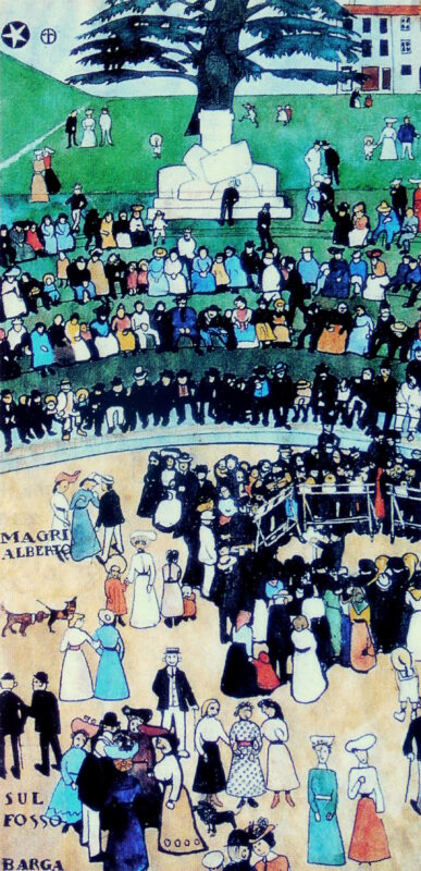 L’impegno di Bruno Sereni fu molto importante per il futuro ricordo di Magri, che ebbe l’effetto di fare da traino circa l’attenzione da prestare agli altri restanti del “quartetto di pittori barghigiani”. Non solo loro ne giovarono ma a tutti quelli che allora e prima si dettero in Barga all’arte della pittura, ecc. Infatti, nel successivo 1965, quando si realizza dopo più di dieci anni la nuova guida di Barga, vediamo che sul frontespizio fu posto un quadro proprio di Magri. Un’opera che fu donata dal pittore al poeta Giovanni Pascoli e si tratta del piazzale dell’antichissimo Fosso, poi intitolato a Vittorio Emanuele II, e l’artistica immagine riproduce un giorno di festa a Barga, però dopo il 28 agosto 1905, anno che fu inaugurato il monumento al patriota barghigiano Antonio Mordini che è alla cima dei degradanti piccoli prati a semicerchio con le sedute per la gente. L’inaugurazione avvenne proprio con un’orazione di Pascoli e il quadro parrebbe un omaggio all’avvenimento che ebbe una bella rilevanza nazionale.
