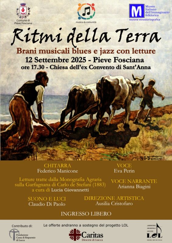 Nella particolare forma del concerto con letture, famosi brani Jazz e Blues, originatisi dai duri ritmi di lavoro manuale e portati in scena da giovani talenti del Liceo Musicale Passaglia di Lucca, si intrecceranno a passi descrittivi tratti dalle pagine della Monografia Agraria sulla Garfagnana (1883) di Carlo De Stefani riguardanti coltivazioni locali, tecniche agrarie e strumenti di cui si è perso l’uso e la memoria. L’etnografia e la musica si contamineranno vicendevolmente, tenute insieme dal filo rosso della fatica fisica e dello stretto legame fra l’uomo e la terra. L’evento vuole essere anche un originale omaggio a Carlo De Stefani, grande figura di studioso con uno speciale vincolo affettivo con Pieve Fosciana e la Garfagnana, scomparso un secolo fa.