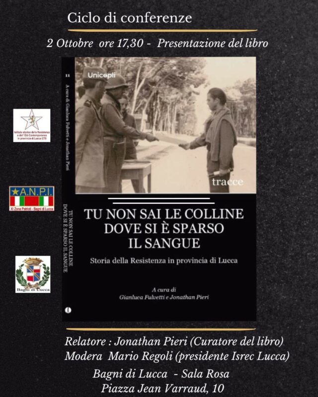 Giovedì 2 ottobre avrà luogo a Bagni di Lucca la presentazione del libro “Tu non sai le colline dove si è sparso il sangue. Storia della Resistenza in provincia di Lucca”. Sarà presente uno dei curatori del libro, il dott. Jonathan Pieri. La presentazione fa oarte di una serie di conferenze organizzate dall’Istituto Storico della Resistenza di Lucca, dalla sezione ANPI XI Zona Patrioti di Bagni di Lucca e dal Comune di Bagni di Lucca.