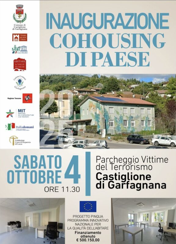 Dopo l’inaugurazione della bellissima biblioteca comunale in prossimità della sede del municipio, il Comune di Castiglione di Garfagnana è pronto a tagliare il nastro sabato 4 ottobre, alle ore 11.30, del secondo progetto PINQuA “Abitare la Valle del Serchio” sul proprio territorio: un co-housing di paese al piano terra dell’edificio in località Case Comunali, antistante il parcheggio Vittime del Terrorismo, che al primo piano ospita la Scuola dell’Infanzia.