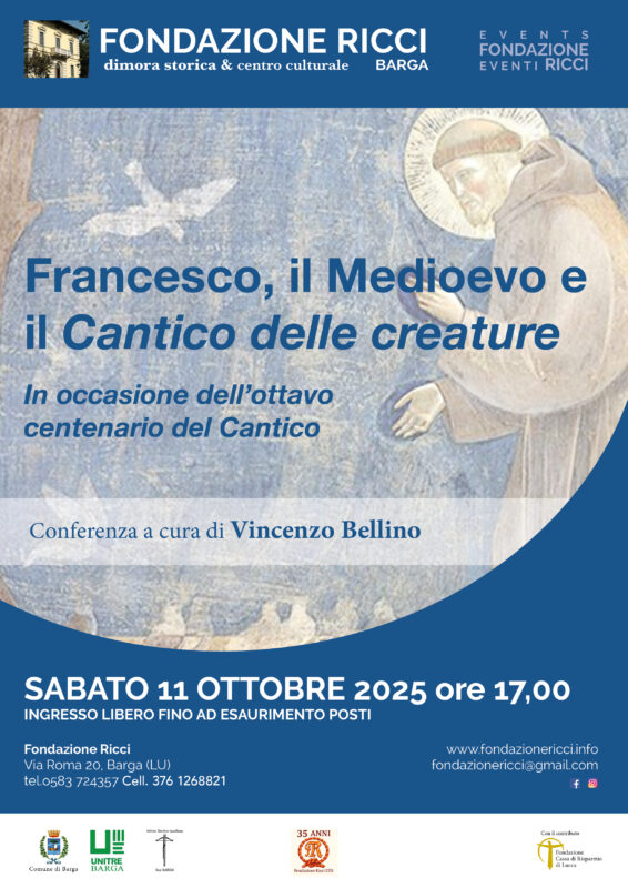 BARGA – Sabato 11 ottobre, ore 17.00 alla Fondazione Ricci di Barga si terrà in occasione dell’Ottavo centenario del Cantico delle creature la conferenza dal titolo “Francesco, il Medioevo e il cantico delle creature” del prof. Vincenzo Bellino.