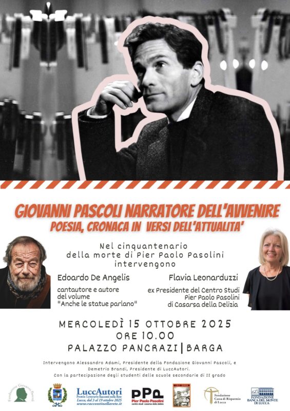 BARGA – Nel cinquantenario della morte di Pier Paolo Pasolini, la Fondazione Giovanni Pascoli e LuccAutori – Premio Racconti nella Rete promuovono l’incontro “Giovanni Pascoli narratore dell’avvenire. Poesia, cronaca in versi dell’attualità”, un appuntamento dedicato al dialogo ideale tra due grandi voci della poesia italiana, capaci di leggere il proprio tempo e di anticipare il futuro. Un legame profondo unisce i due autori: Pasolini dedicò infatti la sua tesi di laurea, che ebbe origini assai rocambolesche, a Giovanni Pascoli, riconoscendone l’attualità e la modernità linguistica.