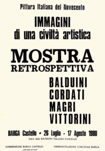 Il titolo della mostra che ebbe luogo nella sala consiliare del Comune di Barga fu “Pittura italiana del Novecento – Immagini di una civiltà artistica”, poi i nomi dei pittori: Balduini, Cordati, Magri e Vittorini. Cosicché ciò che Balduino Balduini aveva sperato sulla Cronaca di Pisa de’ La Nazione, ora si stava avverando nei giorni dal 26 al 17 agosto 1980, grazie all’ufficiale lavoro portato avanti dalla Commissione Barga Castello e Amministrazione Comunale.