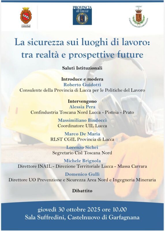 Interverranno: Alessia Pera, rappresentante di Confindustria Toscana Nord (Lucca – Pistoia – Prato), Massimiliano Bindocci – Coordinatore UIL Lucca, Marco De Maria, RLST CGIL Provincia di Lucca – Lorenzo Sichei, Segretario CISL Toscana Nord – Michele Brignola, Direttore INAIL – Direzione territoriale Lucca/Massa Carrara e Domenico Gullì, Direttore U.O. Prevenzione e Sicurezza Area Nord, Ingegneria Mineraria.