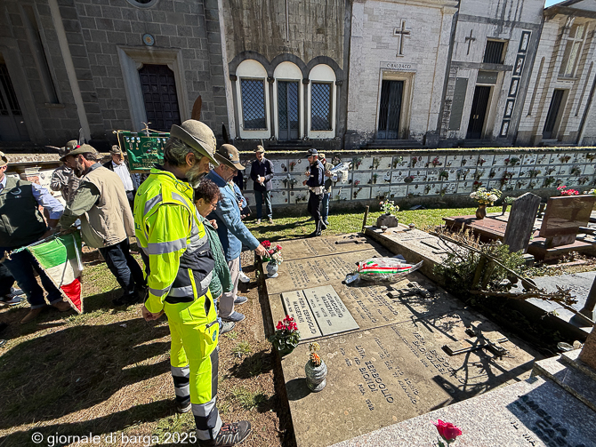 Tra i primi momenti stamani al teatro dei Differenti un incontro con le varie delegazioni dell’Associazione Nazionale Alpini organizzato dal centro Studi della sezione Pisa Lucca e Livorno. Prima del pranzo al cimitero urbano di Sigliari con la deposizione di un mazzo di fiori alla tomba della famiglia Zerboglio, dove riposano le spoglie dei genitori del Sottotenente Enzo Zerboglio, alpino del Battaglione Aosta caduto sul monte Grappa nel 1918. A lui è intitolata proprio la sezione ANA di Pisa, Lucca e Livorno ed a lui è legata anche Barga visto che qui Zerboglio, nato a Pisa nel 1898, risiedeva. Le sue spoglie riposano sul Monte Grappa, ma a Barga c’è la sua lapide e quella di tutti i familiari. Alla cerimonia era presente per la sezione ANA il presidente Domenico Bertolini ed altri esponenti del direttivo. A fare gli onori di casa per il gruppo Alpini di Barga il capogruppo Andrea Bertolini. Per l’amministrazione comunale c’era il vice sindaco Lorenzo Tonini, da sempre vicino alle “penne nere”. Tra le bandiere presenti quella della sezione di Pisa Lucca e Livorno e quella dei gruppi di Barga, Firenze e Pisa.