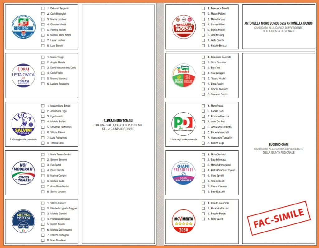 Sulla scheda i simboli sono incolonnati sulla sinistra e, a fianco, è indicato il candidato presidente collegato, il cui nome, in caso di coalizione, si trova all’interno di un rettangolo ampio corrispondente alle liste che lo sostengono. Accanto ad ogni simbolo si trova sulla scheda l’elenco dei candidati consiglieri della circoscrizione con una casella a fianco da contrassegnare per indicare la preferenza. Di circoscrizioni ce ne sono tredici in tutta la Toscana: quattro per la città metropolitana fiorentina e una per ciascuna altra provincia.