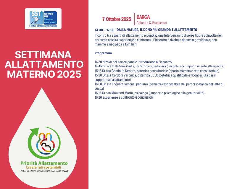 BARGA – Dal 1° al 7 ottobre 2025 si celebra la Settimana mondiale per l’allattamento materno (SAM), iniziativa promossa in Italia dal Movimento allattamento materno italiano (MAMI) con l’obiettivo di sostenere, promuovere e sensibilizzare l’opinione pubblica sull’importanza dell’allattamento al seno, come diritto fondamentale per la salute di neonati, madri e società nel suo complesso.