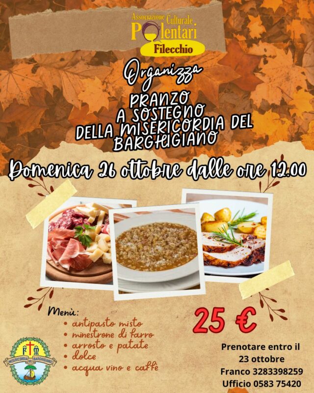 FILECCHIO – I Polentari di Filecchio organizzano il “Pranzo a sostegno della Misericordia del Barghigiano“, evento che si terrà il giorno 26 ottobre presso gli impianti sportivi di Filecchio.