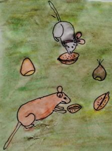Al risveglio decisero di dare un nome alla loro reggia, VILLA 2TI, così rosicchiarono una tavoletta e l’attaccarono fuori dalla porta. Ben presto diventarono amici dei pochi topi che abitavano vicino a loro e insieme ballavano, andavano alla ricerca di noci e nocelle ma non dovevano fuggire ad ogni minimo rumore come in città.