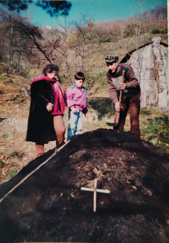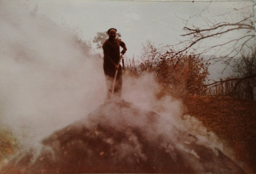 Il nonno sorvegliò e rimboccò la carbonaia giorno e notte, aggiungendo legna fino a quando il camino non fu pieno di braci, poi lo chiuse e lasciò che il calore, dall’alto tornasse in basso, cuocendo la legna.