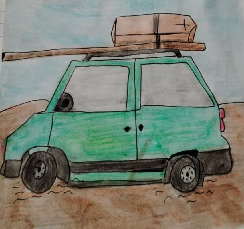 Piacque così tanto che alcune insegnanti di Fiano ci invitarono a ripeterlo una mattina nella loro scuola. Noi accettammo ma il difficile era trasportare le scene, perché, gigantesche ed ingombranti, non si potevano caricare dentro al pulmino del Comune, con i bambini, non solo per una questione di spazio, ma soprattutto per motivi di sicurezza. Parecchi dei docenti furono perciò costretti a fare il viaggio con la propria auto, carica di cartoni, scatole, tavole… Io avevo la Panda 4x 4 con il portapacchi e lì sistemarono qualche travicello un po’ troppo lungo ed una cassa da morto realizzata per lo spettacolo da un abile genitore. Si vedeva che era piccola, ma da lontano faceva una certa impressione e così i colleghi cominciarono bonariamente a prendermi in giro…