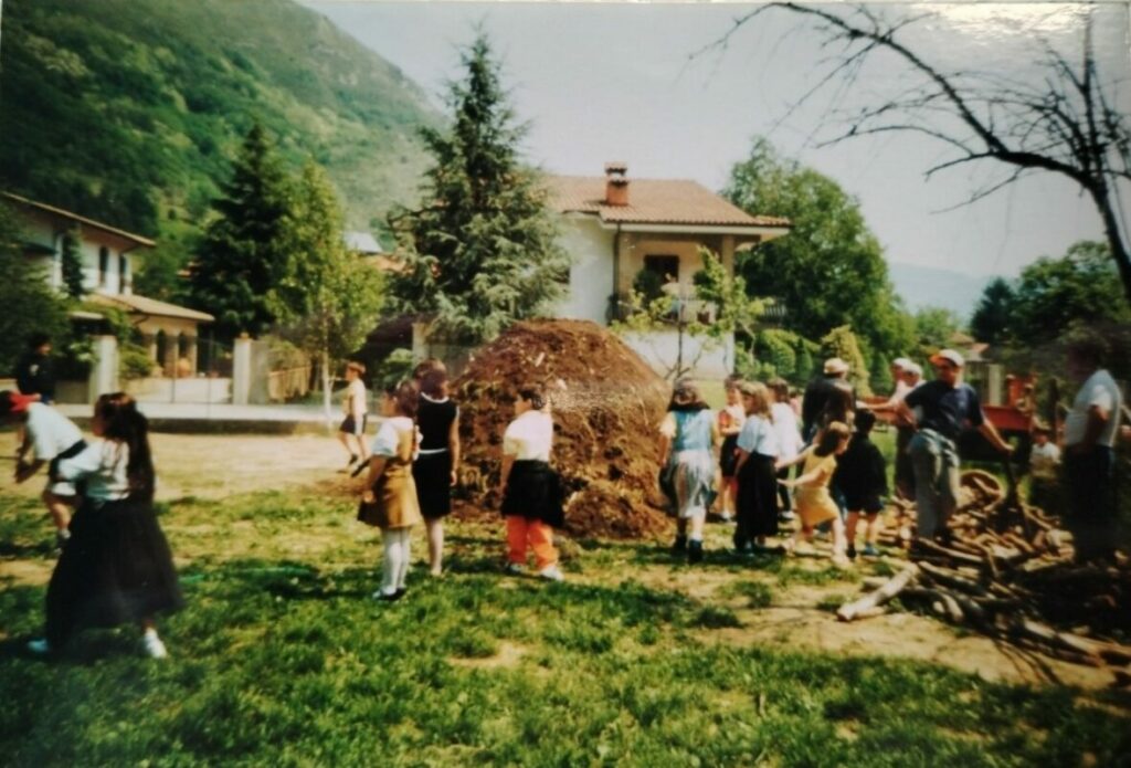 L’ultimo anno in cui insegnavo a Diecimo riproposi l’esperienza al secondo ciclo, ma la carbonaia fu costruita nel giardino della scuola da un nonno del posto che si dichiarò disponibile, bisognava però trovare la materia prima, cioè la legna.