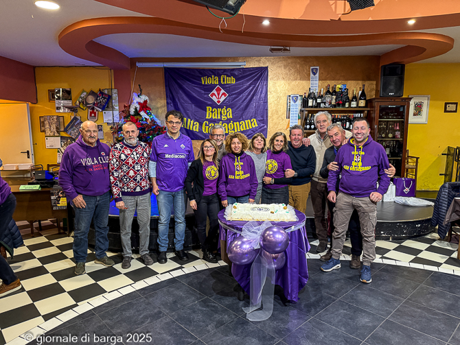 FORNACI – Nella accogliente cornice del Ristorante Il Bugno di Fornaci di Barga, che ancora una volta ha saputo distinguersi con la sua squadra in cucina ed in sala per ospitalità e qualità, si è svolta venerdì 28 novembre la cena conviviale del Viola Club Barga e Alta Garfagnana, nato nel 2021 dalla fusione dei due club, e che oggi è uno dei più numerosi gruppi di tifosi della Viola fuori dai confini della provincia di Firenze. La partecipazione è stata numerosa in questo un evento che è stato arricchito dalla presenza di un grande tifoso viola e di un personaggio del mondo della tv e della radio noto e stimato quale Gianfranco Monti. Gianfranco al Viola Club Barga e Altra Garfagnana è di casa essendo già stato ospite del gruppo nel 2023 ma è molto legato anche alla Vallata per la sua passione per la pesca che lo porta ogni tanto ad arrivare sulle sponde del Serchio, e soprattutto per gli anni trascorsi in Valle quale conduttore di vari programmi di Videomusic al Ciocco, dove arrivò nel 1988 e rimase fino al 1994.