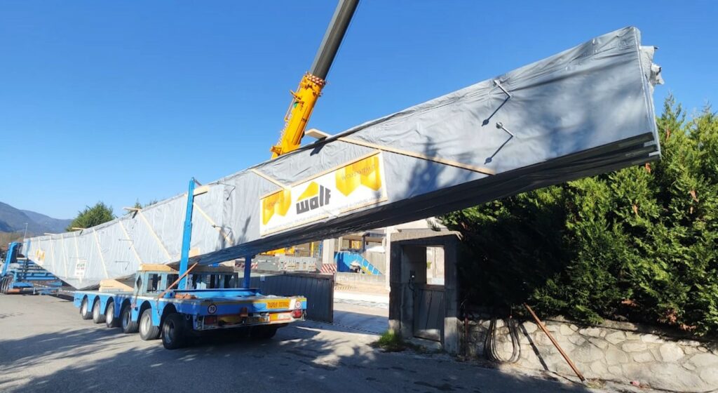 Le sette architravi in legno, lunghe 40 metri, servono per la copertura di un’azienda che si occupa di riciclare carta, e sono arrivate dall’Austria