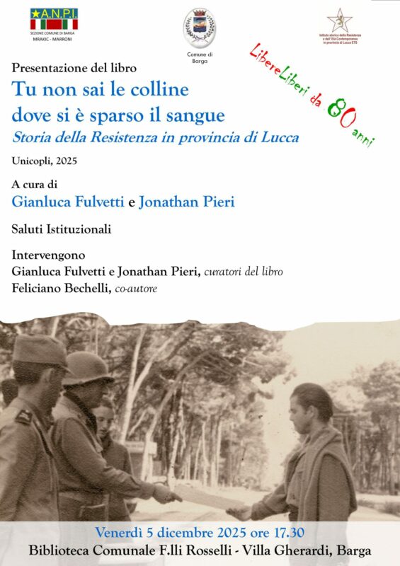 BARGA – La sezione ANPI Barga e l’Istituto Storico della Resistenza di Lucca, con il patrocinio del Comune di Barga, presentano alle ore 17.30 di venerdì 5 dicembre il libro: “Tu non sai le colline dove si è sparso il sangue. Storia della Resistenza in provincia di Lucca” a cura di Gianluca Fulvetti e Jonathan Pieri. L’incontro si terrà presso la biblioteca comunale F.lli Rosselli presso Villa Gherardi (Via dell’Acquedotto.