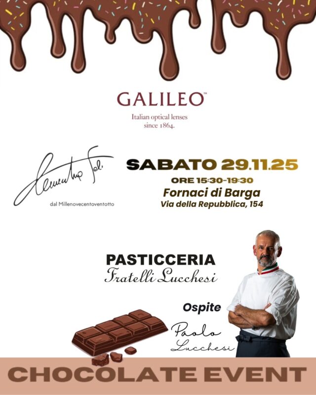 FORNACI – Un evento speciale all’Oreficeria Ottica Clementina Foli in via della Repubblica a Fornaci. Sabato 29 novembre, dalle 15,30 alle 19,30, in collaborazione con Galileo Italia e la pasticceria Lucchesi, Clementina ed il suo staff vi aspettano per un pomeriggio conviviale tra presentazioni e informazioni sulle lenti oftalmiche e brindisi e cioccolatini.