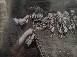 Ancora negli anni ‘60 nelle nostre valli c’era una diffusa economia, sommersa ma florida, fornita dalle donne che dipingevano a mano le statuine in gesso. Una ad una. Stendevano le statuine grezze su tavoloni sollevati, e poi con un pennellino cominciavano dalla prima, con un colore base, in genere il blu chiaro del mantello della Madonna. Poi il viso, la bocca color rosa, gli interni degli occhi in azzurro, i capelli biondi e via così… Ogni statuina riceveva la sua pennellata, precisa senza sbaffature; ogni pezzo un’opera d’arte. Unica. File lunghissime di statuine di tutte le dimensioni, tutte dipinte con elegante maestria e delicatezza stese ad asciugare.