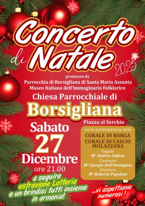 BORSIGLIANA – Per un saluto alla comunità e lo scambio di auguri per il nuovo anno che si avvicina, il Museo Italiano dell’Immaginario Folklorico e la Parrocchia di Borsigliana di Santa Maria Assunta organizzano, sabato 27 dicembre alle ore 21 presso la Chiesa di Borsigliana (Comune di Piazza al Serchio), il Concerto di Natale. Per l’occasione, la Corale di Barga e la Corale di Cascio-Molazzana, dirette dal M° Roberta Popolani e accompagnate dall’organo del M° Andrea Anfuso e dal clarinetto di Giorgio Dell’Immagine, eseguono musiche e canti natalizi. L’evento vuole essere una serata di celebrazione aperta alla comunità e a tutti coloro che cercano un’occasione speciale di condivisione della magia del Natale all’insegna della tradizione.
