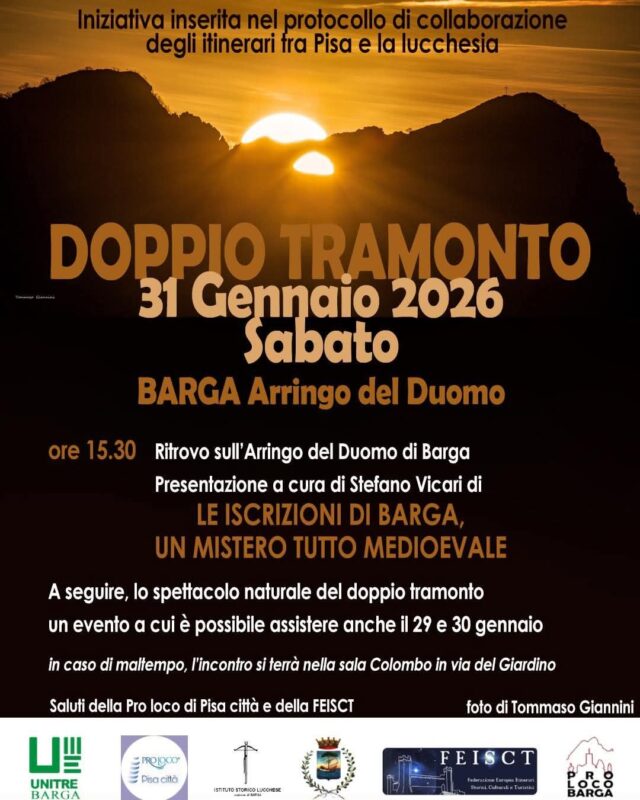 BARGA – Sabato 31 gennaio Barga sarà ancora una volta protagonista di uno degli spettacoli naturali più suggestivi del territorio: il doppio tramonto, il fenomeno ottico che, in alcuni giorni dell’anno, si può ammirare dal Duomo di Barga. L’illusione è quella di vedere il sole tramontare due volte: la prima quando scompare dietro l’arco naturale del Monte Forato, nelle Alpi Apuane, e la seconda pochi istanti dopo, quando cala definitivamente dietro la linea delle montagne.