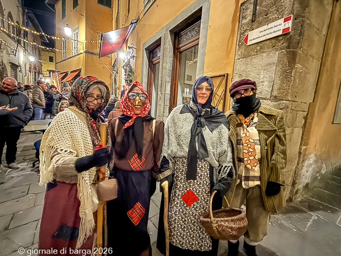 La rassegna delle Befane – Nella sua veste inedita dalle 18 alle 20, dopo il mezzo flop dello scorso anno, ha colto nel segno l’edizione 2026, associata all’aperitivo con la befana. Dalle 18 è stato un crescendo di befane; certamente non la festa ha visto partecipare tutti i gruppi e le befane in giro per le case o nei locali per i canti di questua o per portare doni ai bambini, ma ha sicuramente reso una bella immagine della befana a Barga e di una festa che prova a tenere duro ed a resistere con le unghie e con i denti.