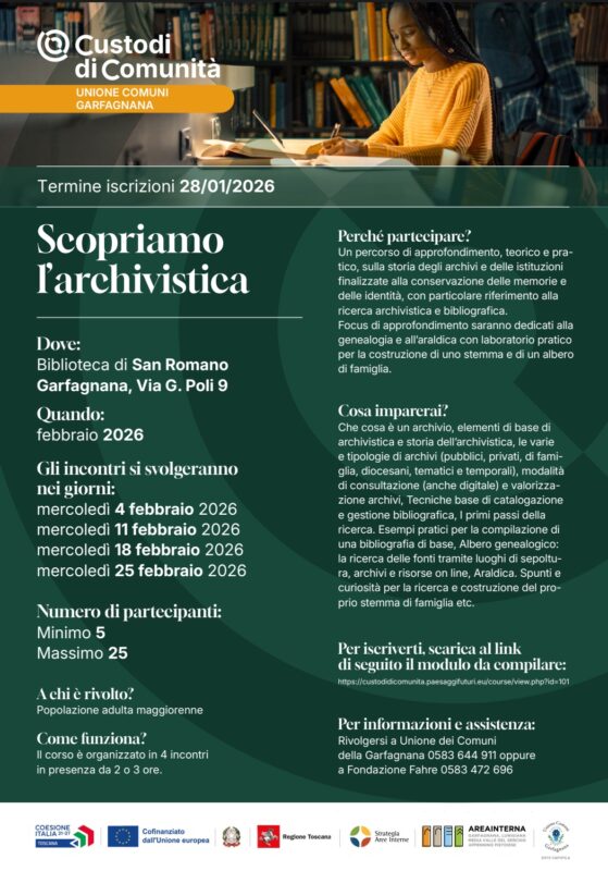 L’iniziativa rientra nell’ambito del progetto “Custodi di comunità: archivi e biblioteche per il benessere e il territorio”, realizzato con fondi europei nell’ambito della programmazione regionale FSE+ 2021-27 e finalizzato a rafforzare il ruolo sociale e educativo di archivi e biblioteche come presìdi culturali per il benessere delle comunità, all’interno della programmazione S.N.A.I. (Strategia Nazionale delle Aree Interne), che vede l’Unione Comuni Garfagnana capofila dell’Area Interna Garfagnana-Media Valle del Serchio-Lunigiana-Appenino Pistoiese.