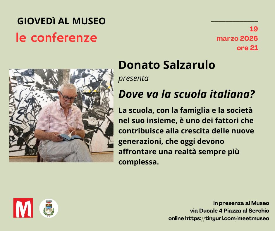 PIAZZA AL SERCHIO – Una riflessione sul sistema educativo italiano e il suo stato attuale è ciò che propone il prossimo appuntamento dei Giovedì al Museo, il 19 marzo alle ore 21, con la conferenza Dove va la scuola italiana?, ospite Donato Salzarulo. È possibile assistere all’incontro unicamente online, prenotandosi al link: https://bit.ly/giovedimarzo26. Si rilascia attestato di partecipazione su richiesta.