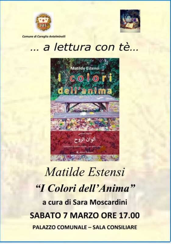 Sabato 7 marzo alle ore 17, presso la Sala Consiliare del Palazzo Comunale di Coreglia Antelminelli, la poetessa e pittrice bargo-modenese Matilde Estensi sarà ospite del format culturale “A lettura con tè” ideato e curato dalla Consigliera Matilde Gambogi per presentare il suo libro “I colori dell’anima” (Aletti Editore, 2023). A presentarla sarà la Dott.ssa Sara Moscardini.