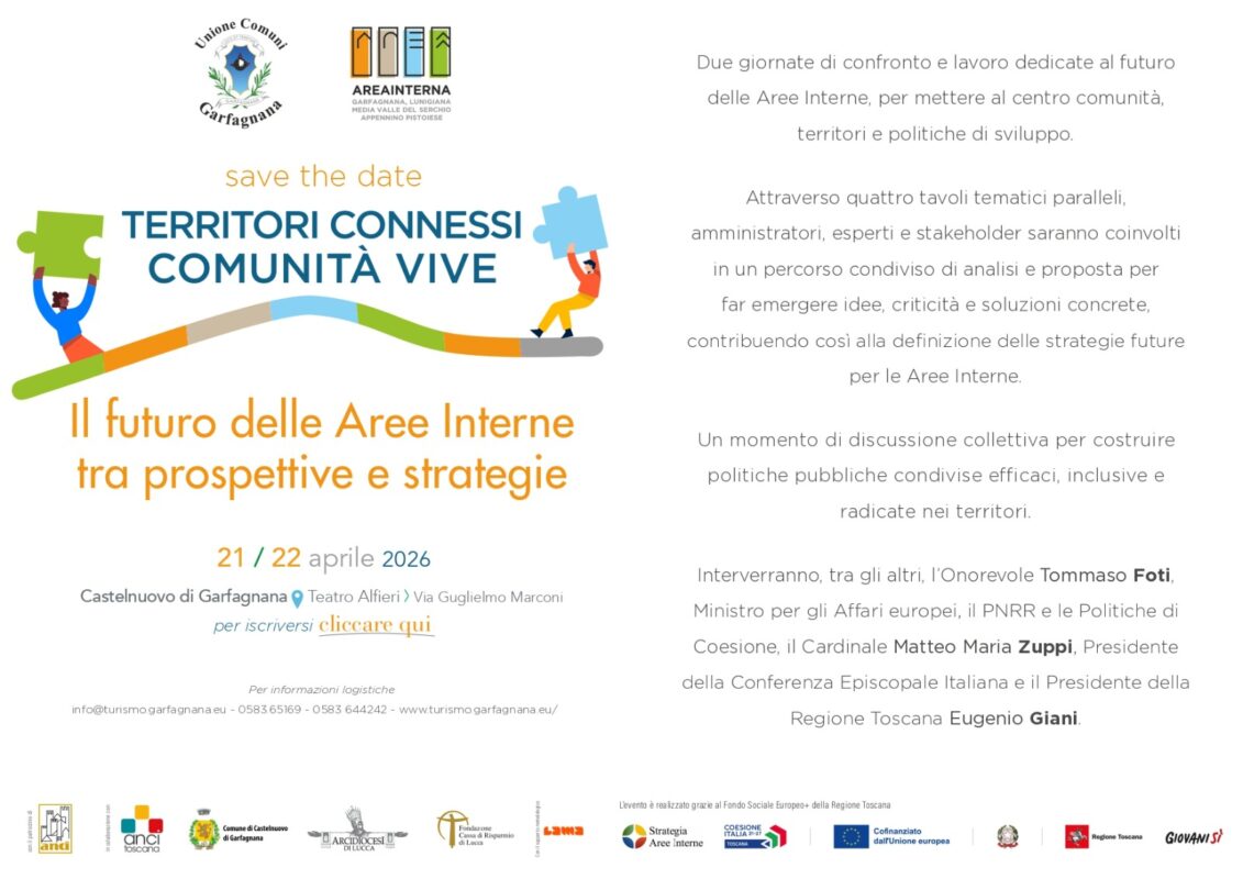 L’Unione Comuni Garfagnana, in qualità di Ente capofila per l’attuazione della Strategia di Area Interna “Garfagnana – Lunigiana – Media Valle del Serchio – Appennino Pistoiese”, organizza martedì 21 e mercoledì 22 aprile, presso il Teatro Alfieri di Castelnuovo di Garfagnana, l’importante convegno “Territori connessi, comunità vive: il futuro delle Aree Interne tra prospettive e strategie”: due giornate di confronto e lavoro dedicate al futuro delle Aree Interne, per mettere al centro comunità, territori e politiche di sviluppo.