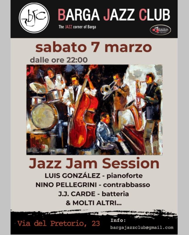 BARGA – Sabato 7 marzo dalle ore 22 torna al Barga Jazz club la serata della jazz jam session con Luis González – Pianoforte, Nino Pellegrini – contrabbasso, J.J. Carde – Batteria e molti altri.